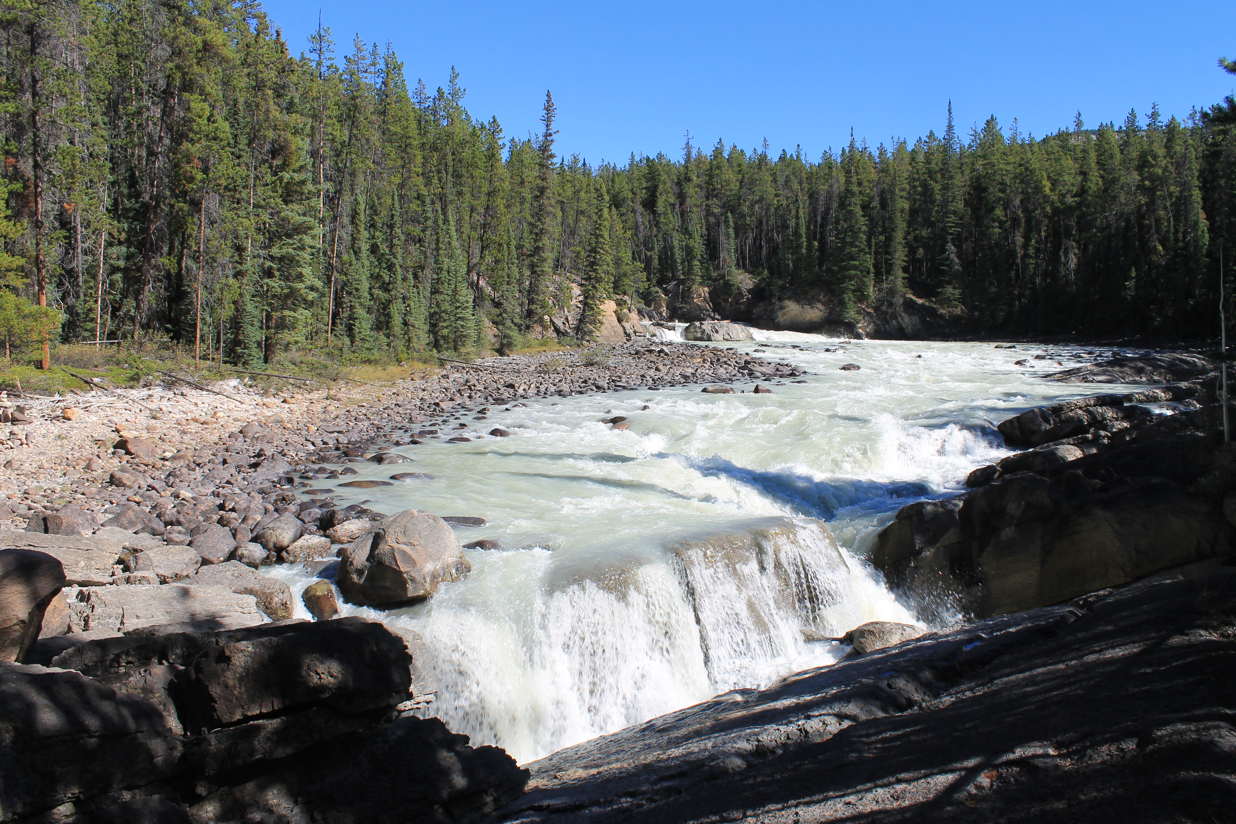 From Jasper heading south, the first major stop was Athabasca Falls. The Athabasca Falls are among the most powerful and breathtaking in the Rocky Mountains. The Athabasca River thunders through a narrow gorge to create the magnificent falls. Parking and restroom facilities, a paved trail and picnic sites are available.