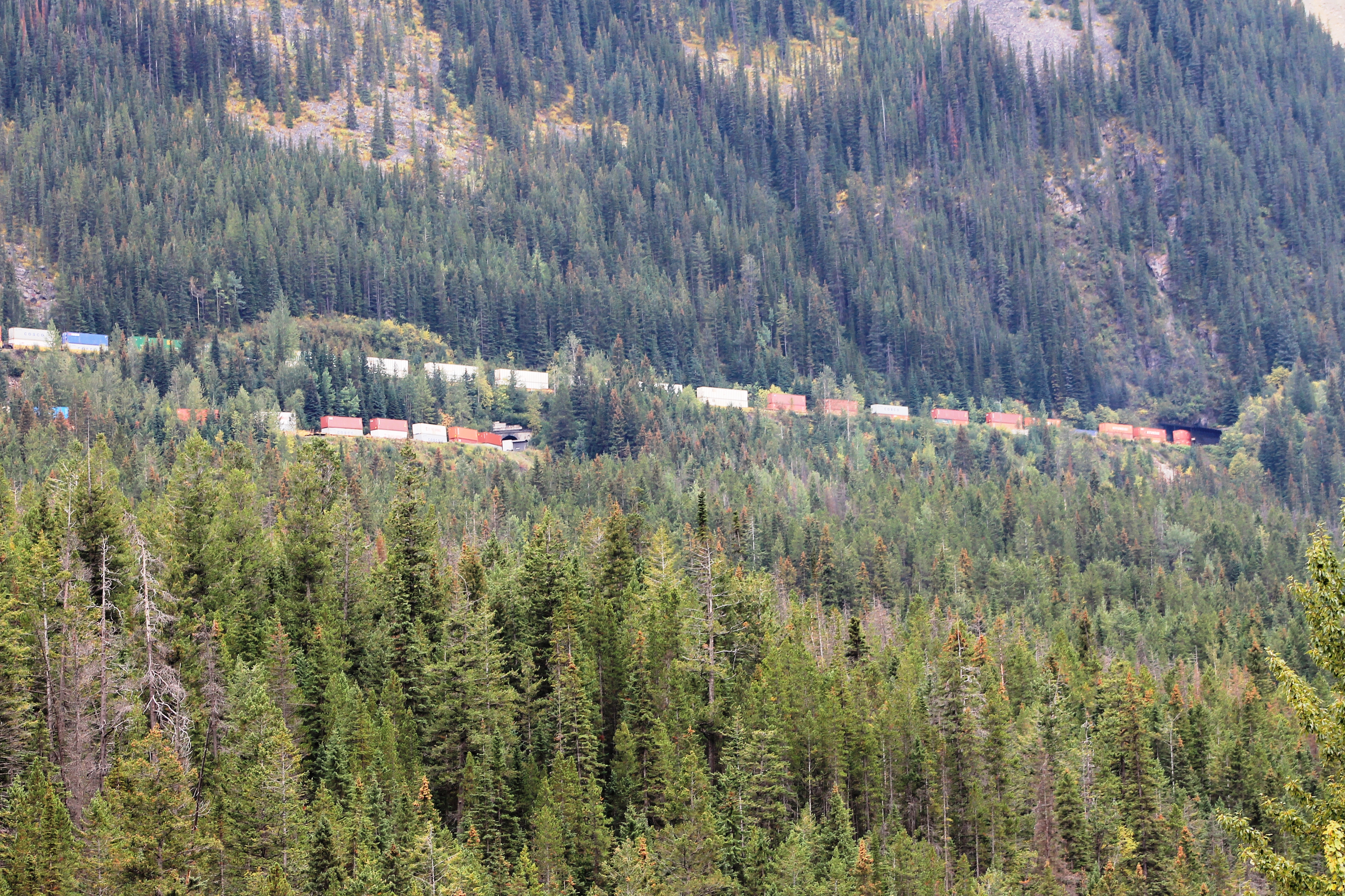 At the Spiral Tunnels viewpoint, we were lucky enough to see the Canadian freight trains pass through the tunnels. There is a single track but it appears to be more than one train as it winds through the spiral and goes through the tunnel. (Of course, there is only one train at a time!) The Upper Spiral Tunnel in Cathedral Mountain can be seen from the pull-off 2.3 km up the Yoho Valley Road.